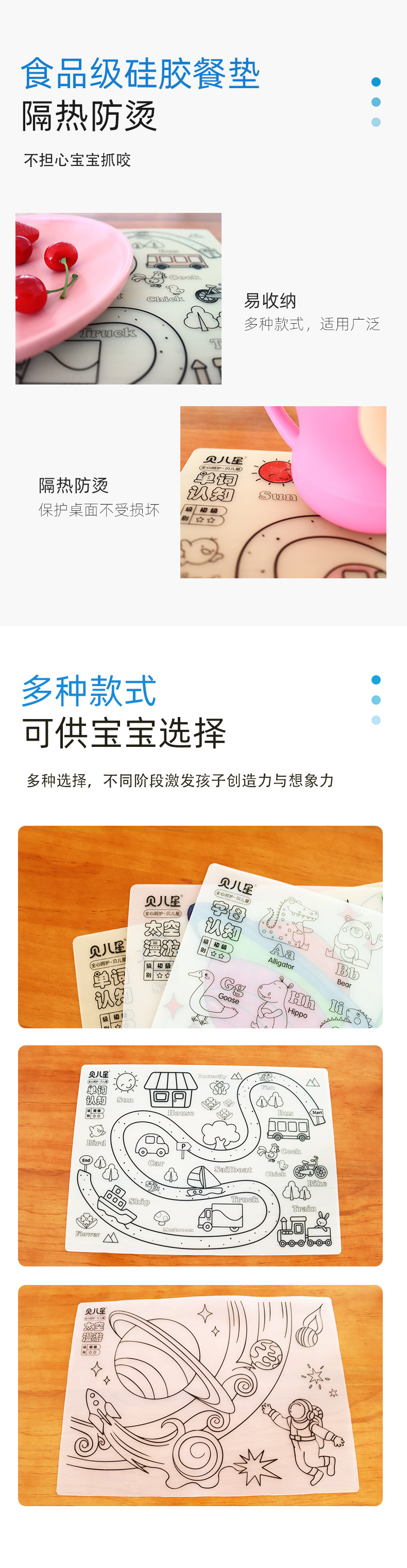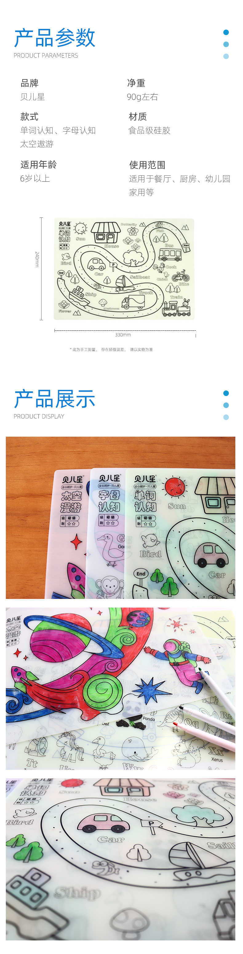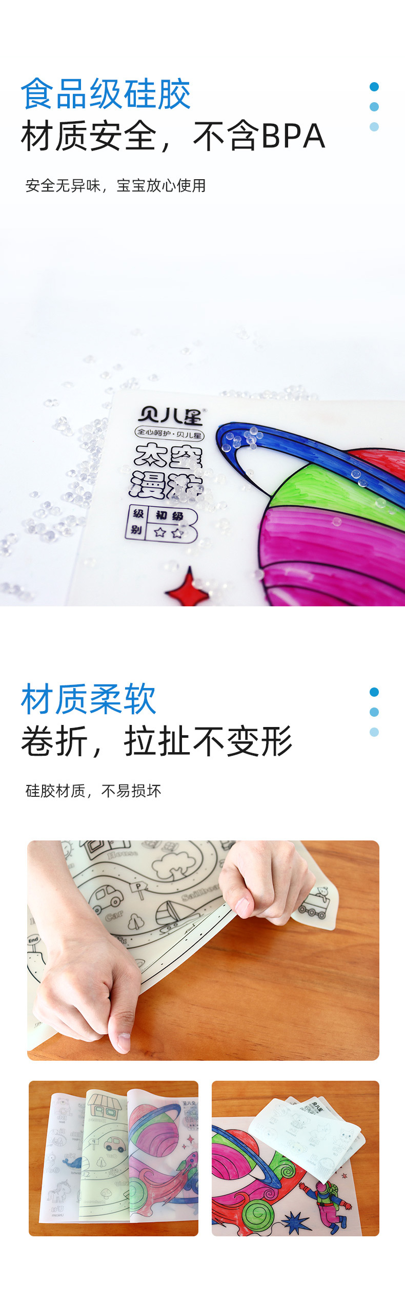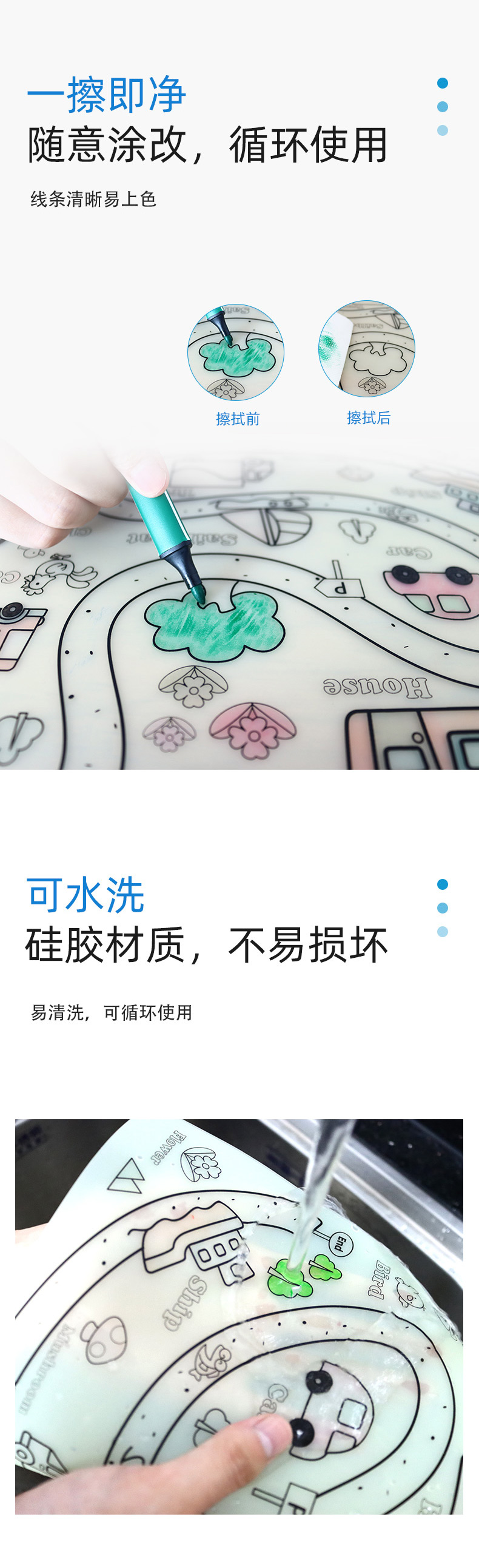 硅膠涂鴉畫板產(chǎn)品的主要買點(diǎn)源于產(chǎn)品的表面圖案以及配套的創(chuàng)意,產(chǎn)品從6-12歲之間具有不同的主題與認(rèn)知圖案,可以連接整體進(jìn)行學(xué)習(xí)提升大腦開發(fā),加強(qiáng)兒童動(dòng)手能力以及創(chuàng)新創(chuàng)作能力,此外產(chǎn)品配比水性可清洗彩色筆,不會(huì)對(duì)硅膠表面產(chǎn)生筆污以及筆畫痕跡,材料屬于柔軟回彈食品級(jí)硅膠,所以硅膠店鋪可以任意曲折來回折疊不會(huì)變形損壞,此外硅膠墊片可水性可隔熱,可耐高低溫,可以在多個(gè)行業(yè)領(lǐng)域當(dāng)中運(yùn)用!